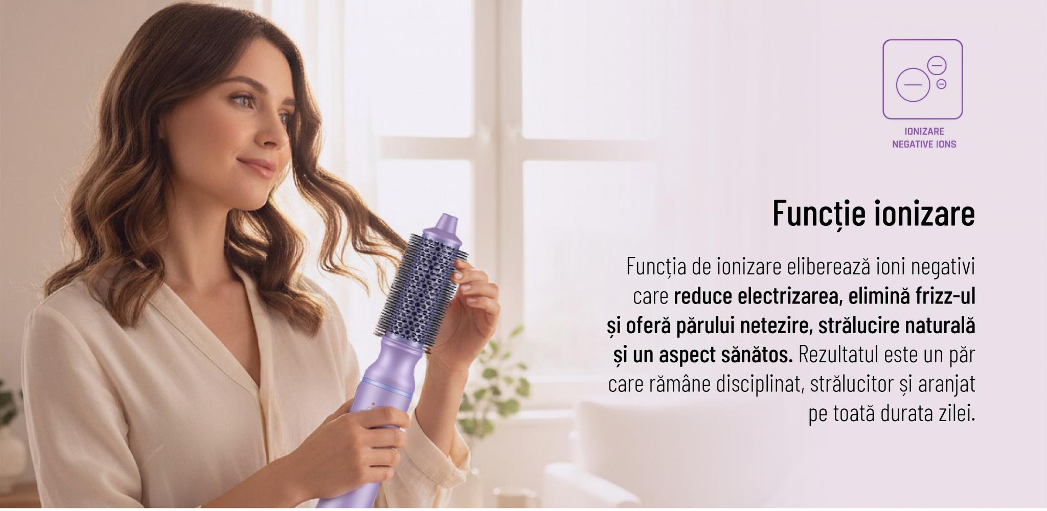 Aparat de coafat Heinner HAS-H13BLDC-V4, Ionizare, Motor BLDC, Putere: 1300 W, 3 trepte de putere, 4 setari de temperatura, Accesorii: ondulator, perie rotunda, uscator, concentrator, Culoare: violet, Garantie: 36 luni