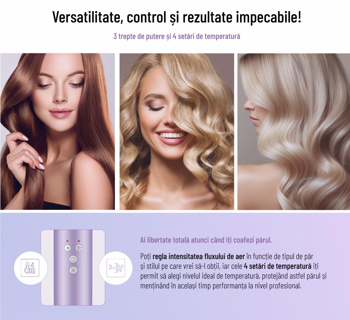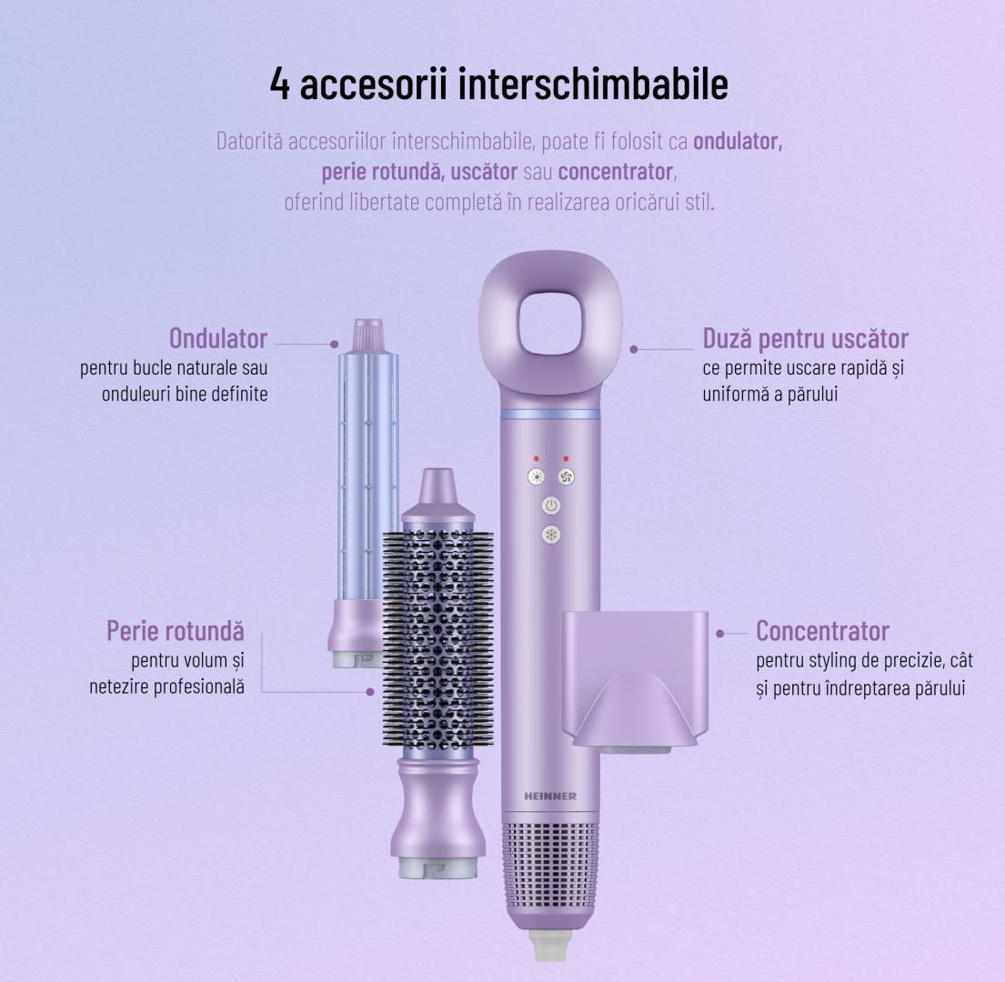 APARAT DE COAFAT HEINNER HAS-H13BLDC-V4, Putere 1300W, Multifunctional 4 in 1, Motor BLDC, 3 trepte de putere, 4 setari de temperatura, Tehnologie Heat Balance, Violet