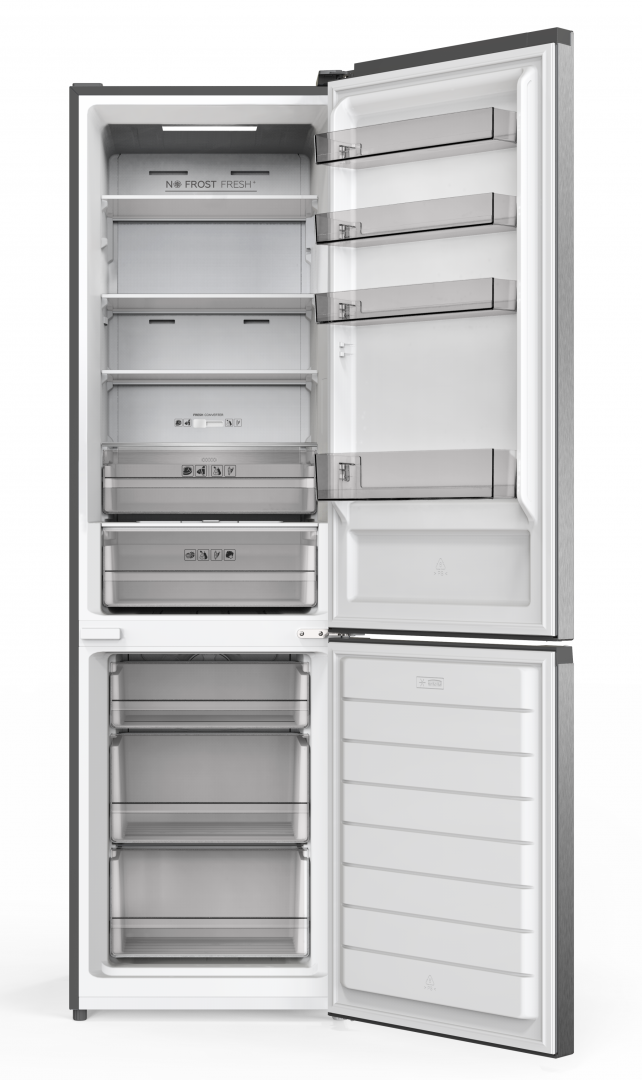 Combina frigorifica Heinner HCNF-HM377INVXC, No Frost, compresor Inverter, clasa energetica: C, capacitate totala: 377 L, capacitate frigider: 264 L, capacitate congelator: 113 L, control electronic, lumina LED, functie ECO, functie Vacanta, functie Super, 3 rafturi din sticla frigider, compartiment convertibil, compartiment pentru fructe si legume cu control de umiditate, 3 sertare congelator, suport oua, tavita cuburi gheata, capacitate de congelare: 10kg/24h, dimensiuni (WxDxH): 60 x 67.5 x 200.5 cm, culoare: Apect inox