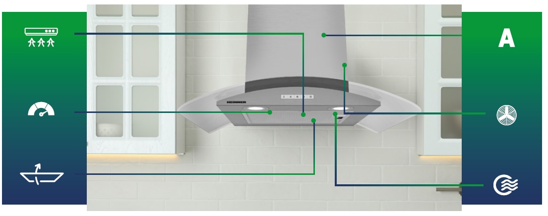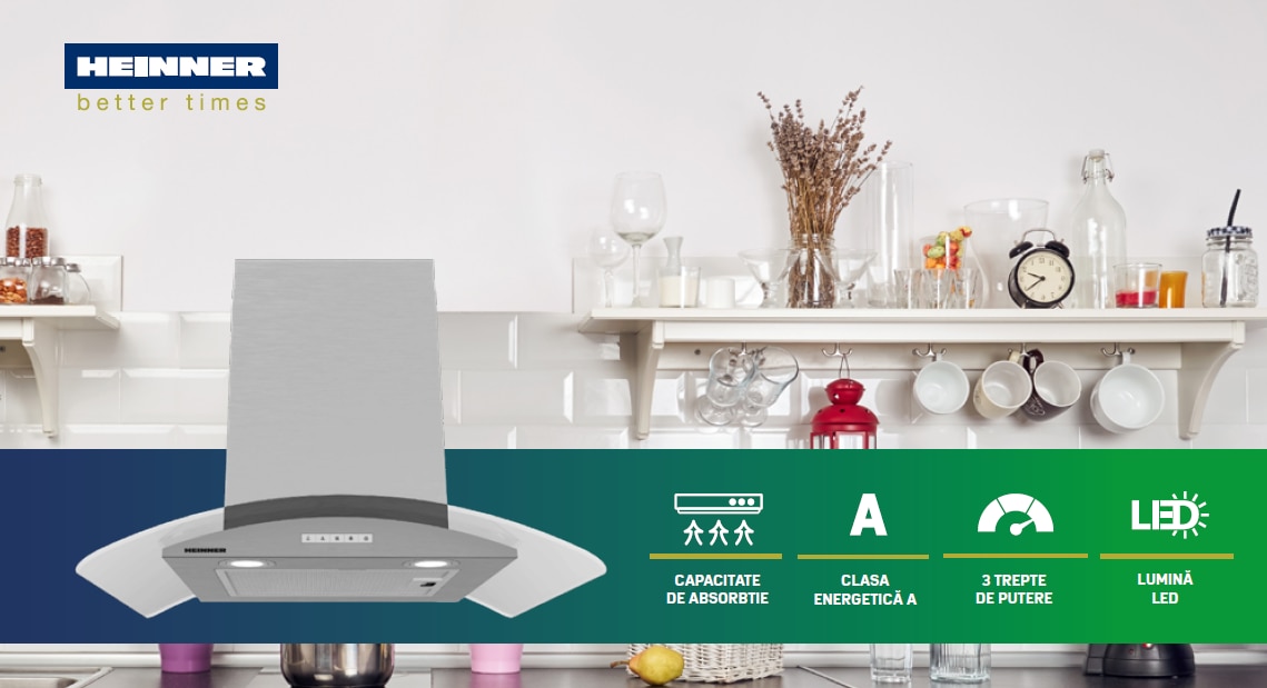 Gateste cu drag si spor pentru cei dragi, fara abur, fum sau mirosuri puternice in bucatarie. Hota decorativa Heinner, cu o capacitate mare de absorbtie, te ajuta sa improspatezi rapid aerul din bucatarie si sa te bucuri de un miros imbietor in casa.