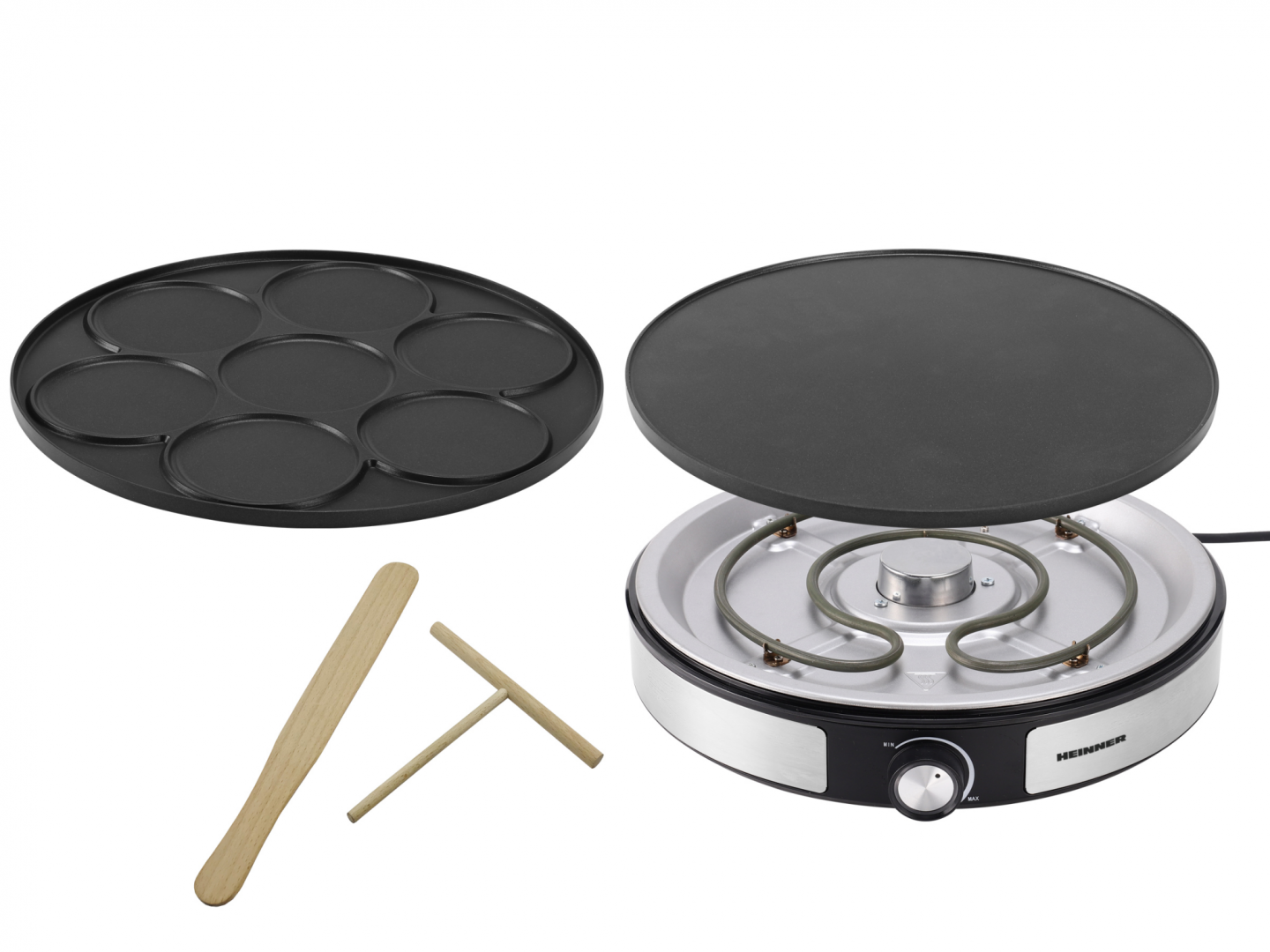 Aparat de facut clatite 2 in 1 Heinner HCPM-F15RVSS, Putere 1500W, Placa reversibila (33 cm), Clatite normale, Clatite stil american, Invelis antiaderent, Buton control temperatura, Indicatori luminosi de folosire, Accesorii: spatula si dispozitiv din lemn pentru intinderea aluatului, Spatiu depozitare cablu: Culoare: negru cu insertii inox