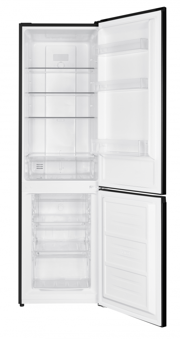 Combina frigorifica Heinner HCNF-HM253BKE++, No Frost, clasa energetica E, capacitate totala: 253L, capacitate frigider: 182L, capacitate congelator: 71L, control electronic cu termostat ajustabil, lumina LED, 3 rafturi din sticla frigider, compartiment pentru fructe si legume, 3 sertare congelator, suport oua, tavita cuburi gheata, capacitate de congelare: 3.2kg/24h, dimensiuni (WxDxH): 54 x 60 x 180 cm, culoare: Negru