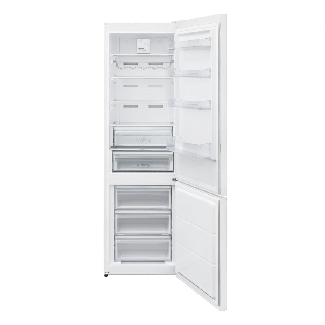 Combina frigorifica Heinner HCNF-V366E++, No Frost Multicooling, clasa energetica E, capacitate totala: 366 L, capacitate frigider: 265 L, Capacitate congelator: 101 L, display pe usa, control electronic, tehnologie Freezer Shield, lumina LED, functie congelare rapida, alarma usa deschisa, sertar Chiller, compartiment fructe si legume cu control umiditate, 3 rafturi din sticla frigider, 3 sertare congelator, suport oua, tavita cuburi gheata, capacitate de congelare: 8kg/24h, dimensiuni (WxDxH): 59.5 x 65 x 201cm, culoare: alb cu decoratiune cromata pe maner
