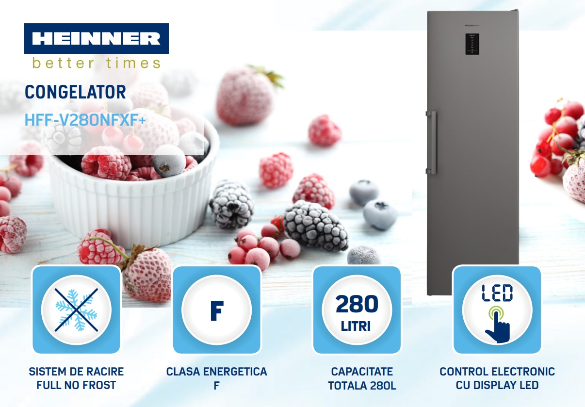 RESIGILAT – CONGELATOR HEINNER HFF-V280NFXF+, Clasa F, 280L, No Frost, 7 sertare, Display, Control electronic, H 186cm, Argintiu