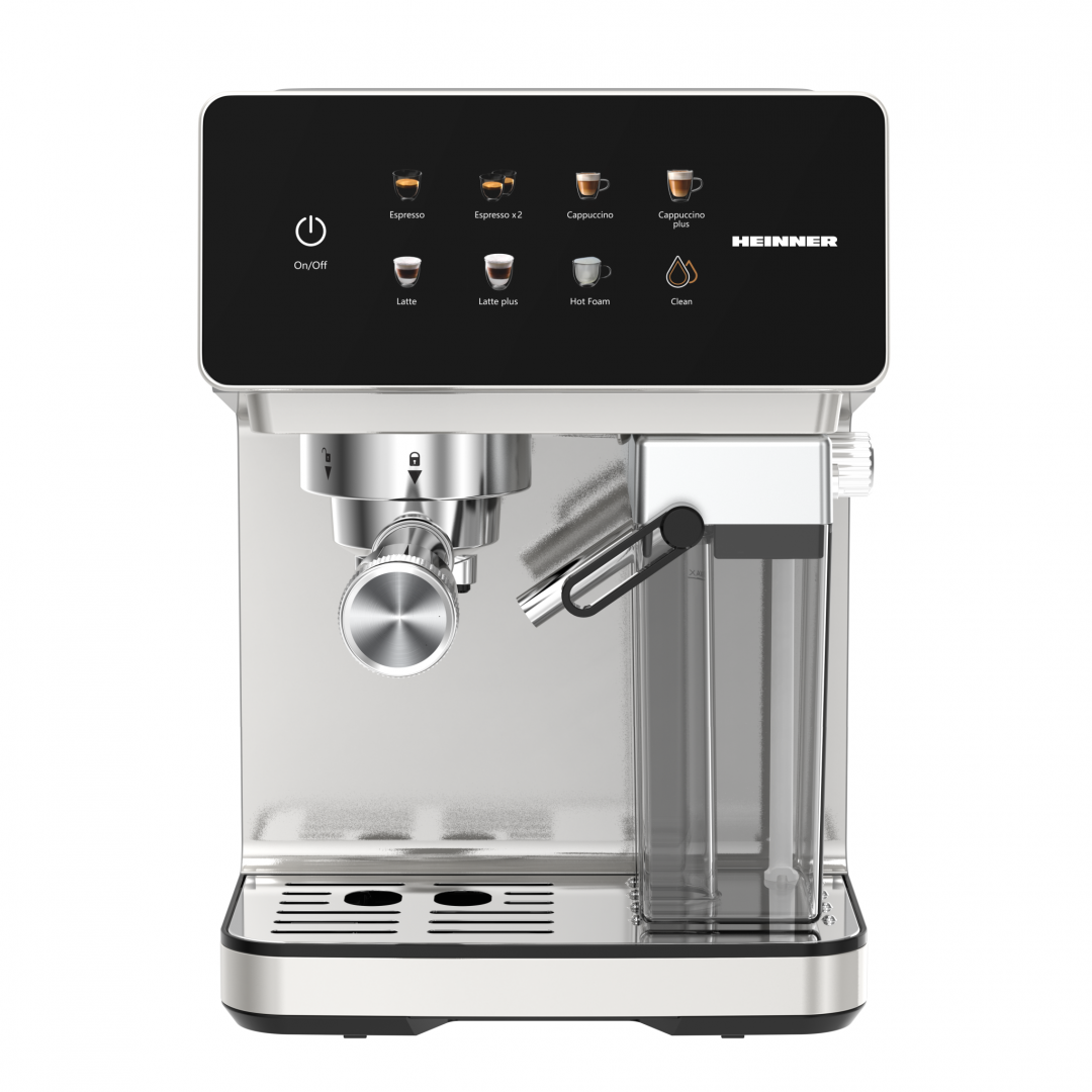 Espressor digital cu rezervor lapte Heinner CreamyBlend HEM-LK20DMLK, 1350W, 20 bar, capacitate rezervor apa detasabil 1.6L, rezervor lapte detasabil 0.5L, panoul digital si control tactil, Inox