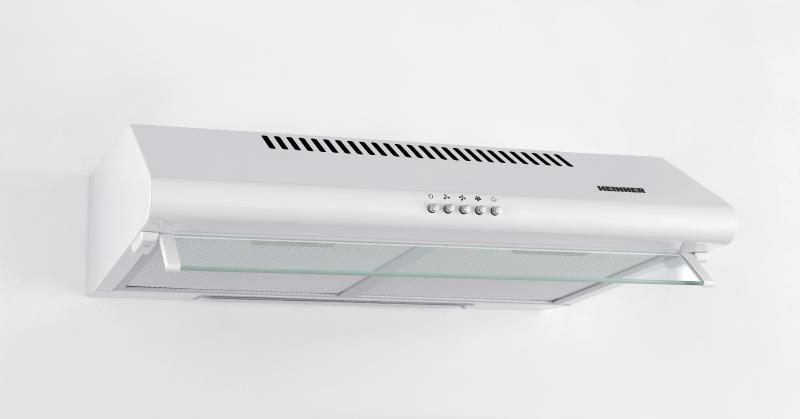 Hota traditionala Heinner CH-400, Latime 60 cm, Putere maxima de absorbtie: 326.4 m3/h, 3 trepte de viteza, Motor: 2 x 60W, Lumina LED: 1 x 2W, 2 filtre aluminiu, Panou sticla frontal, Butoane tip “push”, Diametru tub de evacuare: 120 mm, Dimensiuni (LxAxI): 60x50x15 cm, Culoare: Alb