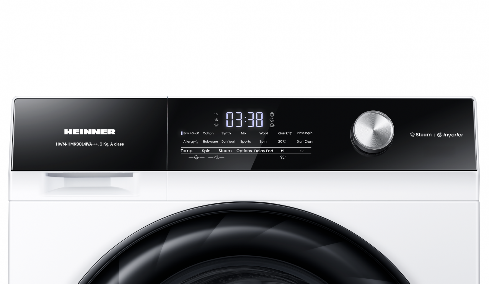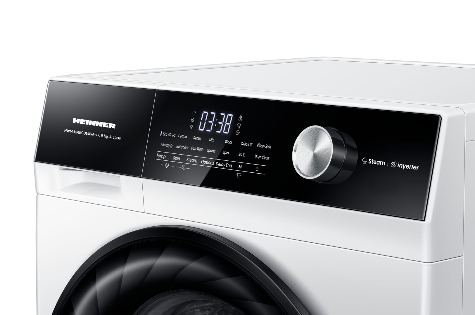 Masina de spalat rufe Heinner HWM-HMK9014IVA+++, Capacitate 9 kg, Viteza de centrifugare 1400 rpm, Clasa energetica A, Motor inverter, 15 programe,Control Touch, Display digital, Program rapid 15 min, Program Allergy Steam, Program Baby Steam Care, Functie intarziere finalizare, Clatire suplimentara, Prespalare, Functie adaugare rufe, Cantarire automata, Memorare program preferat, Selector temperatura, Selector viteza de centrifugare, Blocare acces copii, Dimensiuni (LxAxH): 59.5X61X84.5 cm, Culoare: alb