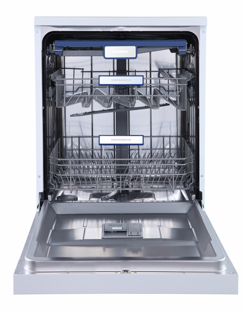 Masina de spalat vase Heinner HDW-FSM60714AWD+++, Extraload – 14 seturi, clasa energetica D, deschidere automata a usii la finalizarea programului, control electronic, display LED, 7 programe de spalare, program Rapid 30’, program Auto Smart: 55°C – 65°C, Deep Clean – Program Hygiene 70°C, program 1H, program Intensiv 65°C, pornire programabila (1-24H), optiune incarcare la jumatate pe ambele cosuri – Dual zone, functie spalare intensa, functie Extra uscare, 3 Cosuri – cos superior tacamuri, Flexible space – cos superior ajustabil pe inaltime (incarcat), cos inferior: 4 suporti farfurii pliabili, blocare acces copii, protectie impotriva inundatiilor – Aquastop, consum apa: 10L/ciclu de spalare, dimensiuni (LxAxI): 60 x 60 x 85 cm, culoare: Alb