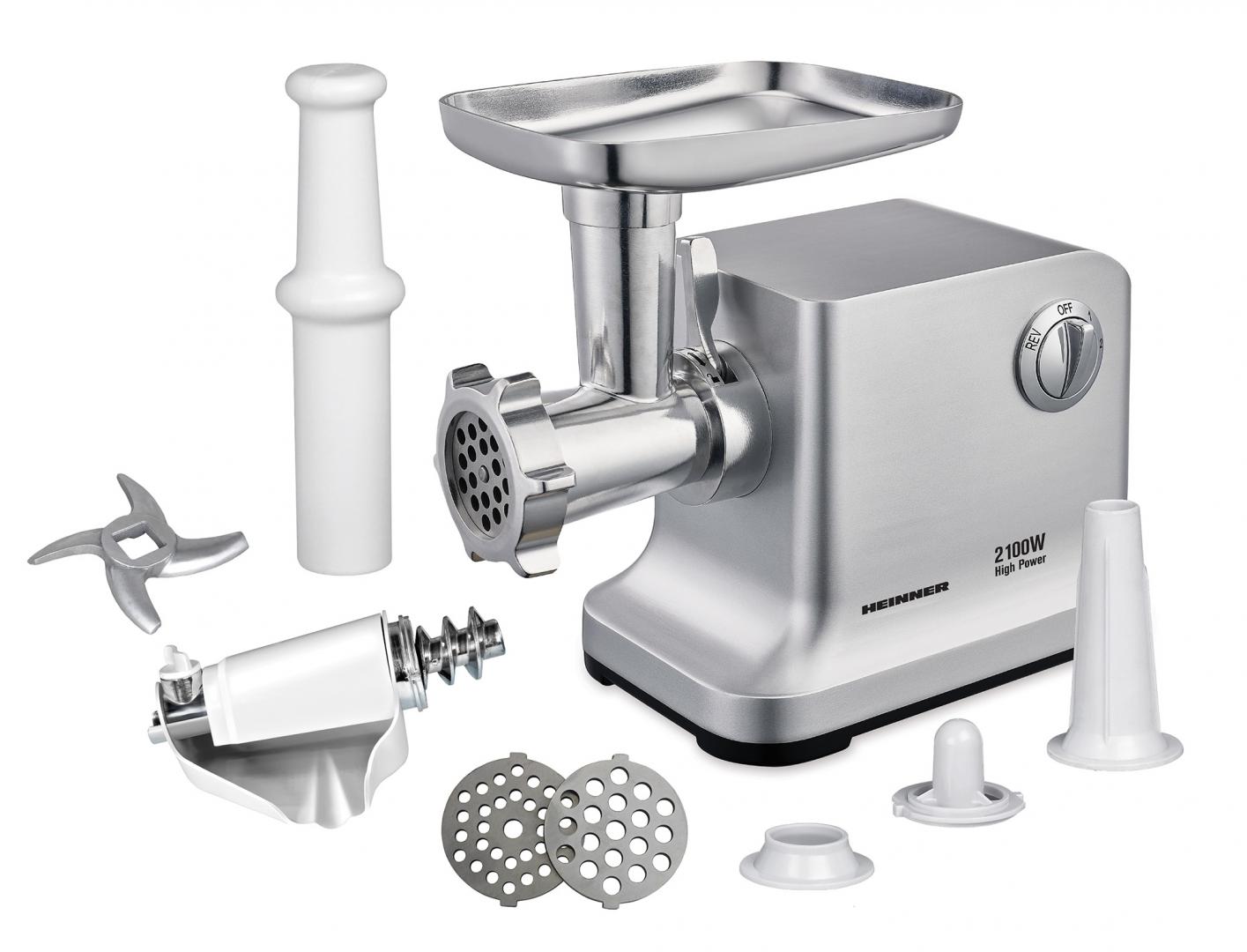 Masina de tocat Heinner MG-2100SS, putere: 2100W, accesoriu pentru rosii, accesoriu pentru carnati, cutit din inox, 2 site de taiere, functie reverse, nivel de zgomot: ≤90dB.
