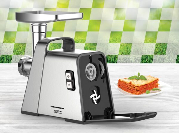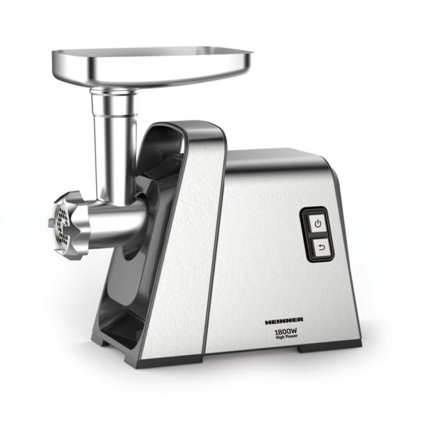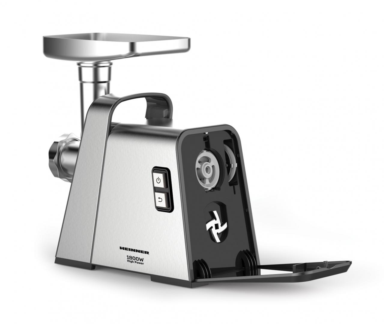 Masina de tocat carne Heinner MG-Y1800X, putere maximă: 1800W, accesoriu pentru roșii, accesoriu pentru cârnați, angrenaje metalice, cuțit din inox, funcție Reverse, 3 site de tăiere, spatiu depozitare accesorii, carcasa de inox cu mâner, capacitate de tocare: 2 kg/min, culoare argintiu