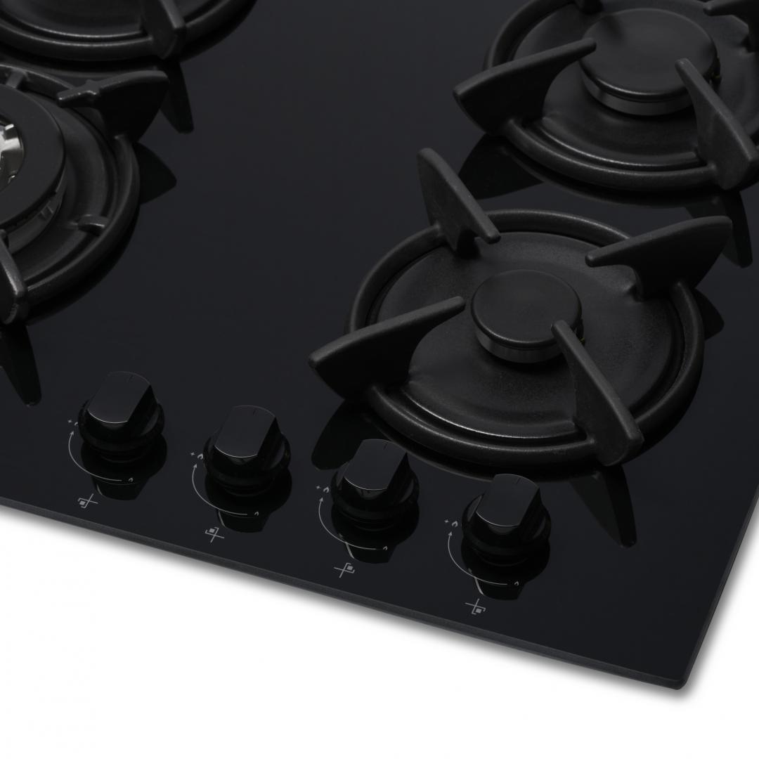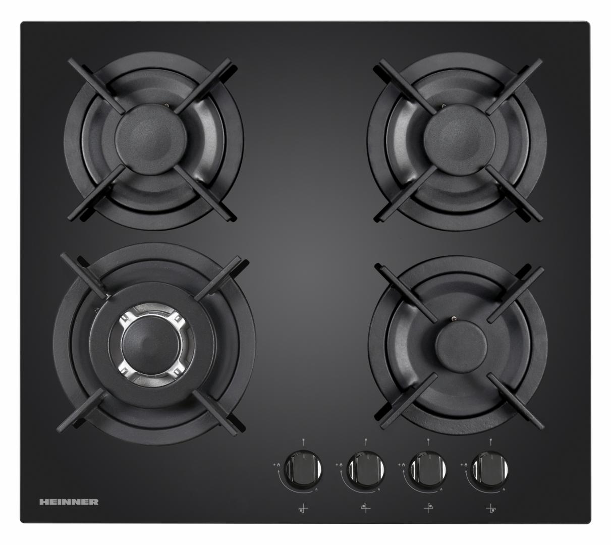PLITA INCORPORABILA HEINNER HBH-V4IWFGBK, Gaz, 4 arzatoare, Latime 60cm, Arzator WOK, Aprindere electrica integrata, Gratar fonta, Sticla neagra