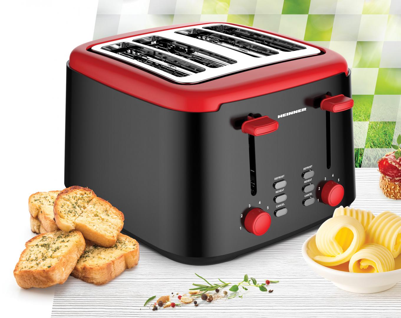 PRAJITOR DE PAINE HEINNER HTP-1450BKR, Putere 1450W, Capacitate 4 felii, 7 niveluri de rumenire, Negru/Rosu