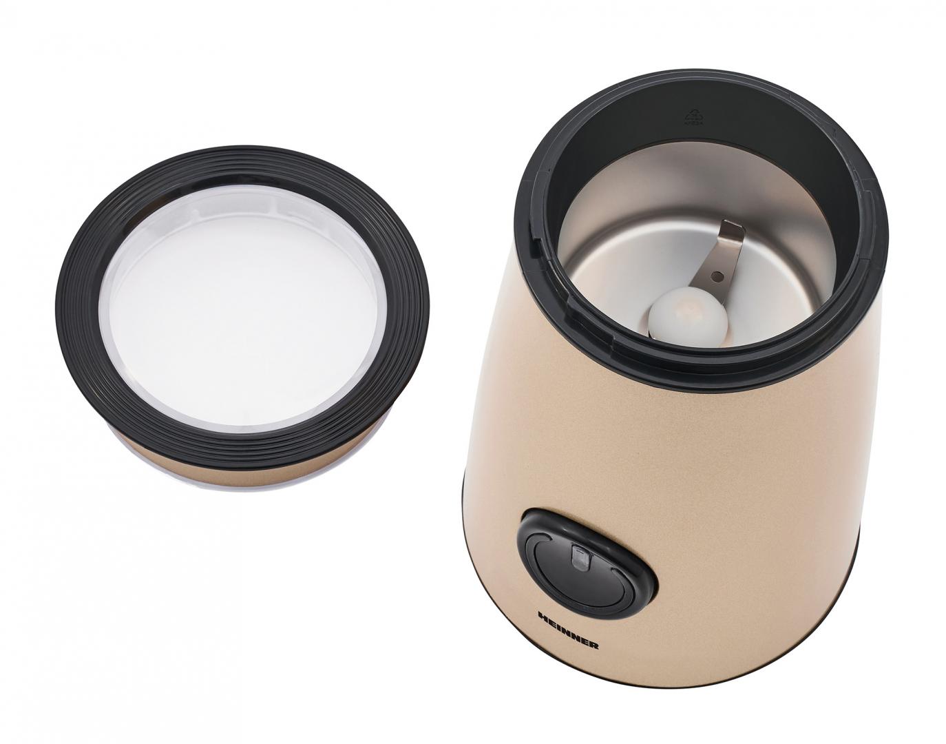 Rasnita electrica HEINNER HCG-150IXGD, putere 150W, capacitate 50G, interior din inox, lame din inox, sistem de siguranta, buton ON/OFF, indicator LED, auriu sidefat