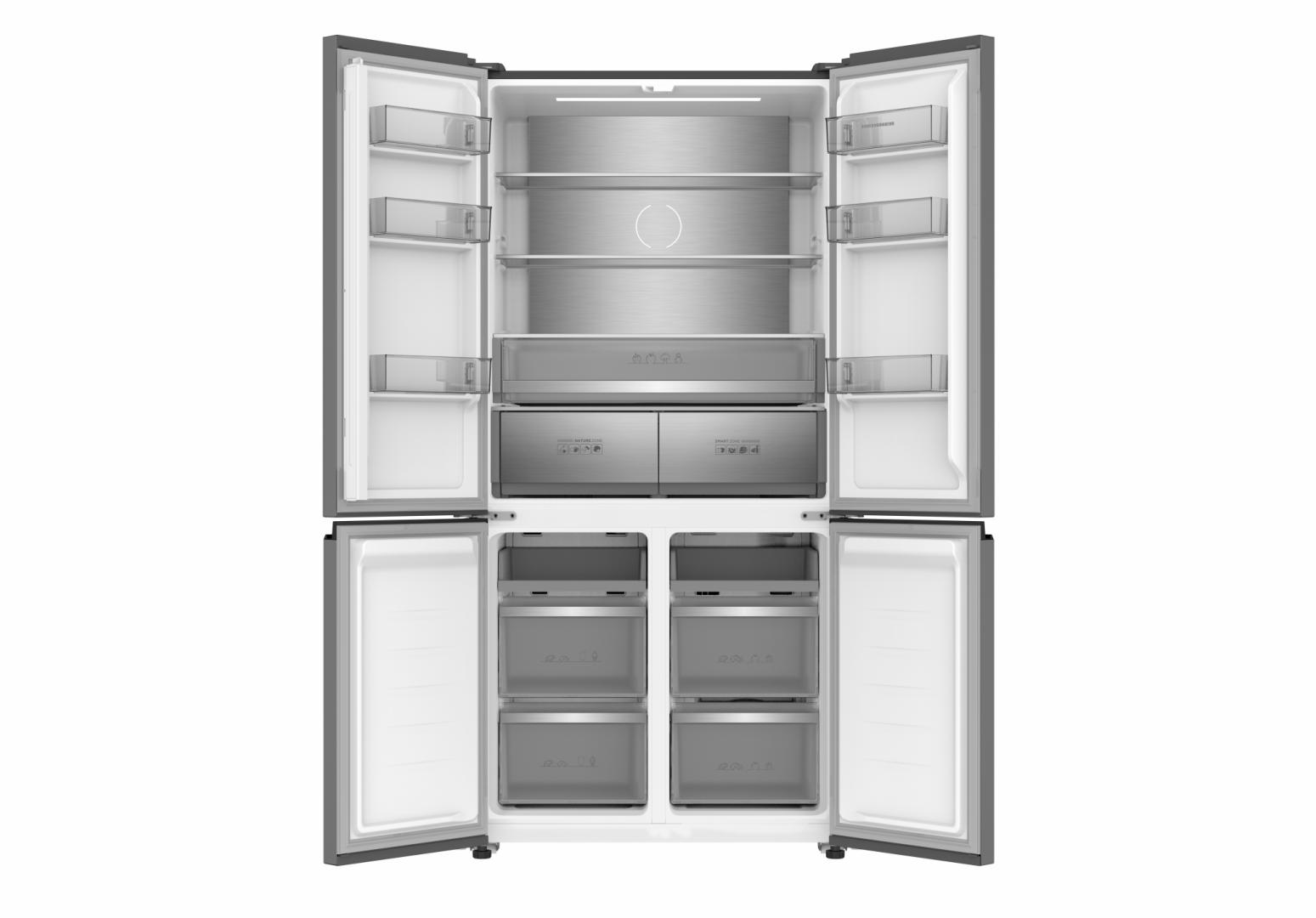 Side by side Multidoor Heinner HSBS-HM505MDSINFDXE++, Slot-in – permite incorporarea in mobila, Total No Frost, capacitate totala: 505L, capacitate frigider: 349L, capacitate congelator: 156L, clasa energetica: E, compresor Inverter, display LED cu control touch, sistem Multi Air-Flow, tehnologie InoxCool, sistem MultiClimate – 4 zone cu control independent al temperaturii (Frigider, congelator, zona convertibila, zona Smart), functie “Holiday”, functie ECO, functie Super racire, functie Super congelare, dotari frigider: 2 rafturi din sticla, compartiment pentru fructe si legume, compartiment cu nivel de umiditate controlat, compartiment Smart – temperaturi intre -3 °C si +3 °C, dotari congelator: 4 sertare, 2 tavite pentru pizza, compartiment convertibil frigider/congelator – temperaturi intre -20 °C si +5 °C, capacitate compartiment convertibil: 80L, lumina LED, alarma usa deschisa, blocare acces copii, dimensiuni (WxDxH): 90.5 x 59.7 x 190.2 cm, culoare: Inox Antracit