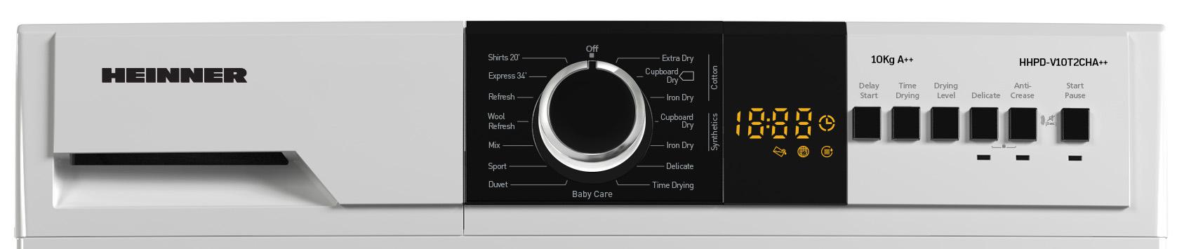 Uscator de rufe cu pompa de caldura Heinner HHPD-V10T2CHA++, Capacitate incarcare 10 kg, Clasa energetica A++, 15 programe de uscare, Display LED, Program rapid camasi 20 min, Program expres 34 min, Program Baby Care, Functie Start intarziat, Functie anti-sifonare, Lumina cuva, Selector nivel uscare, Indicator curatare filtru scame, Indicator rezervor colectare apa plin, Blocare acces copii, Dimensiuni ( LxAxI): 63.9×59.6×84.5 cm, Culoare: Alb