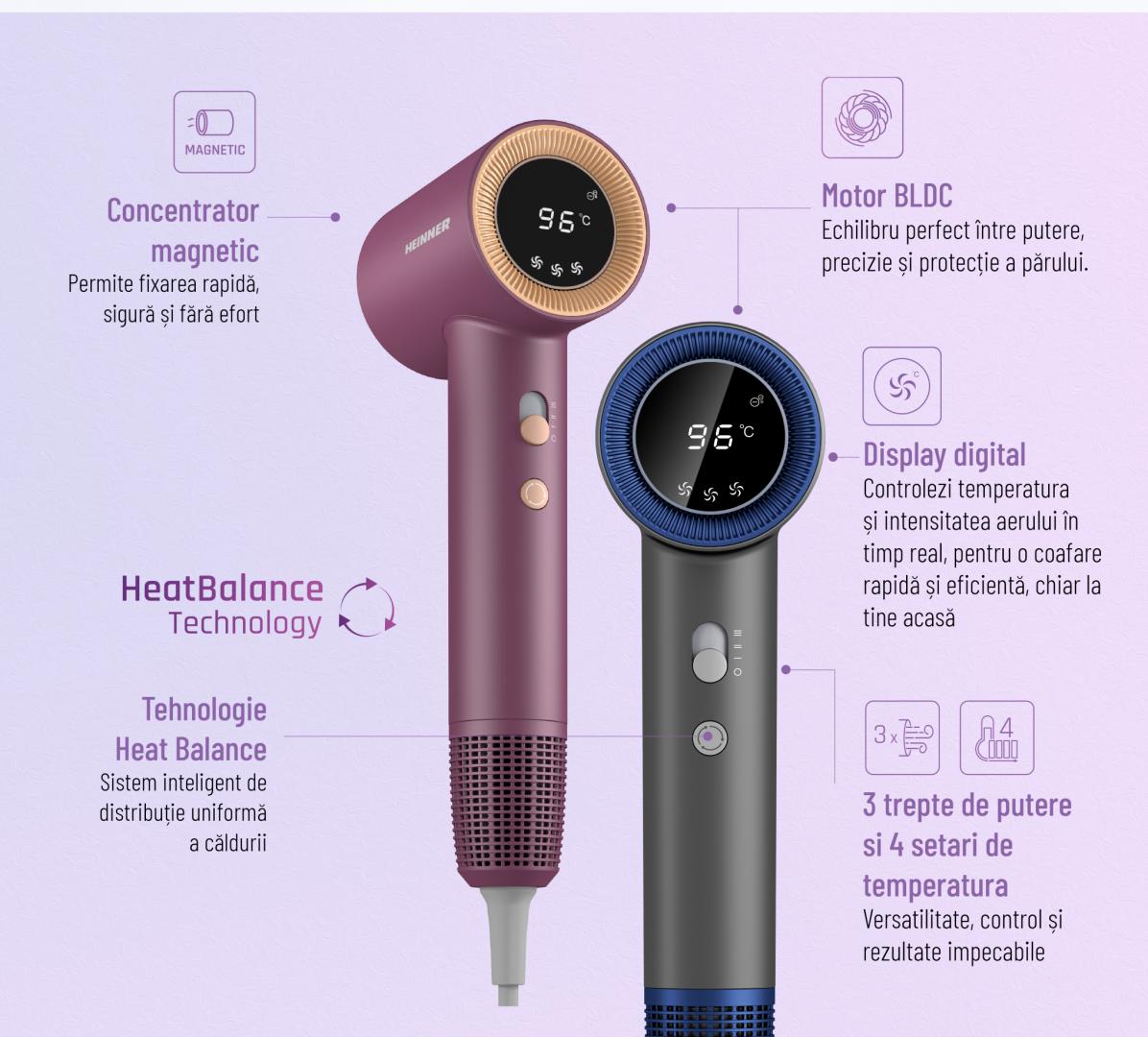 Uscator de par Heinner HHD-H17DBLDC-PP, Tehnologie Heat Balance, Ionizare, Motor BLDC, Putere: 1700 W, Display digital, 3 trepte de putere, 4 setari de temperatura, Concentrator magnetic, Culoare: mov, Garantie: 36 luni