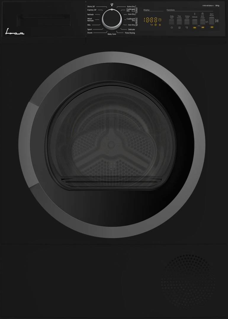 Uscator de rufe cu pompa de caldura Fram FHPD-V8T2BKA++, Capacitate incarcare 8 kg, Clasa energetica A++, 15 programe de uscare, Display LED, Program rapid camasi 12 min, Program expres 29 min, Program Baby Care, Functie Start intarziat, Functie anti-sifonare, Lumina cuva, Selector nivel uscare, Indicator curatare filtru scame, Indicator rezervor colectare apa plin, Blocare acces copii, Dimensiuni (LxAxI): 59.6×60.9×84.5 cm, Culoare: Negru